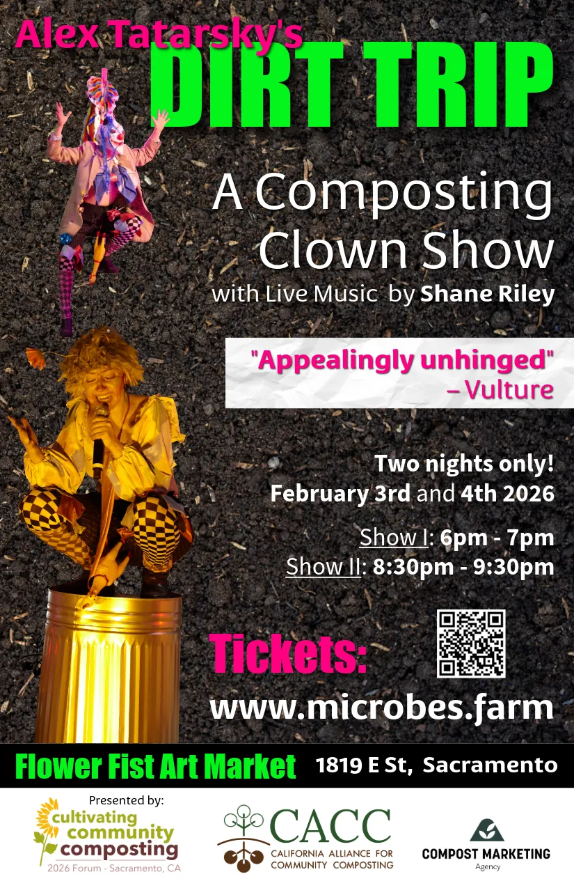 We are bringing this show to Sacramento because it's the perfect performance for compost people. Compost Clown speaks to composters, waste-workers and soil lovers in a language beyond science or activism. It reaches into the heart of what composting is about - letting go, trusting decay, finding value in what seems worthless, and